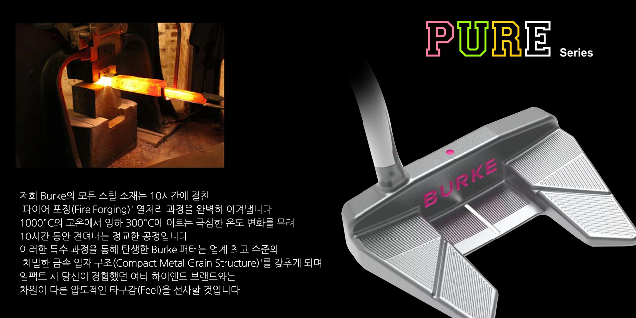 | Unique Tour Fit Face Putter Face Structure Design: Enhancing the Ball's Forward RollTOUR FIT Face (T.F.F.) 기술 Burke 퍼터의 투어 핏 페이스(Tour Fit Face, T.F.F.) 구조 설계는 가장 핵심적인 특징 중 하나입니다 이 독특한 디자인은 퍼터 페이스의 표면 텍스처와 탄성을 최적화하여 볼의 순회전(Forward Roll)을 획기적으로 향상시킵니다 이를 통해 견고한 타격감(Solid Impact)과 완벽한 피드백 사운드를 극대화합니다 실제 사용 시, 볼이 타격된 직후 불필요한 측면 스핀과 미끄러짐(Skidding)을 줄이고 훨씬 빠르게 안정적인 볼구름 상태에 진입하는 것이 확연히 드러납니다 결과적으로 퍼팅의 정확도와 일관성이 비약적으로 향상됩니다 Tour Fit Face는 장거리 퍼팅이든, 짧고 정교한 퍼팅이든 상관없이 볼의 구름 궤적을 더욱 효과적으로 제어할 수 있도록 도와주어, 퍼팅을 더욱 쉽고 정확하게 만들어 줍니다 |