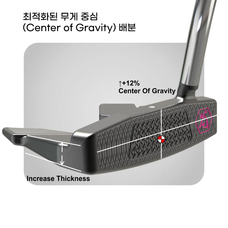 Thicker Main Body Wings본체에 두꺼운 윙(Wings, 날개 형태의 돌출부)을 특징으로 하며, 이는 무게 중심(CG)을 높이고 관성 모멘트(MOI)를 증가시켜 볼의 구름을 더욱 일관성 있게 만듭니다 또한, 이러한 설계는 임팩트 시 피드백 감각을 향상시키고, 지면에서의 볼 구름 성능을 개선하며, 퍼터에 더욱 안정적이고 견고한 외관을 더해줍니다 |